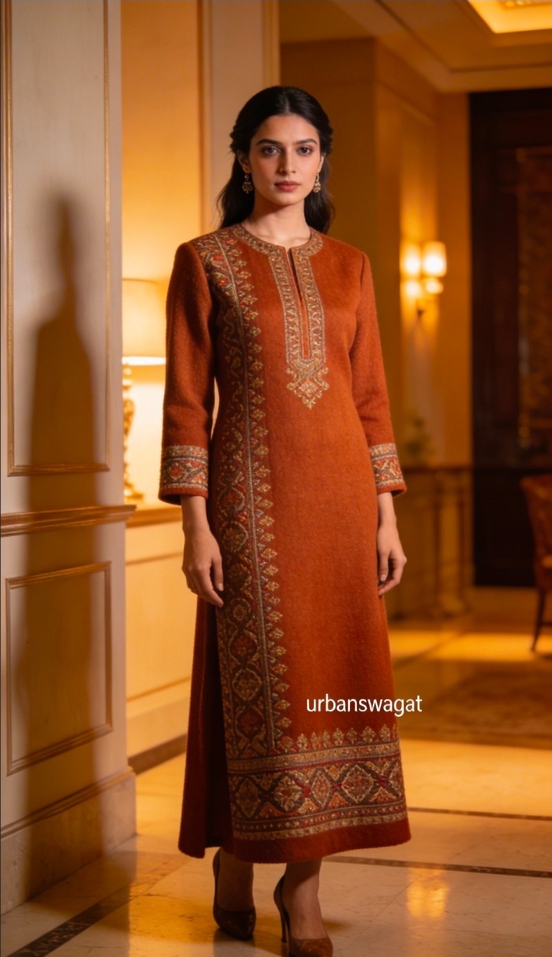 The kurta is rendered in a deep, vibrant burnt sienna, crafted from high-quality Kashmiri wool that provides warmth without the weight. Its most striking feature is the asymmetrical vertical border of traditional Aari embroidery that runs along one side, balanced by a richly detailed neckline and matching sleeve cuffs. The clean lines and ankle-length cut offer a modern, elongated silhouette that is as flattering as it is comfortable.