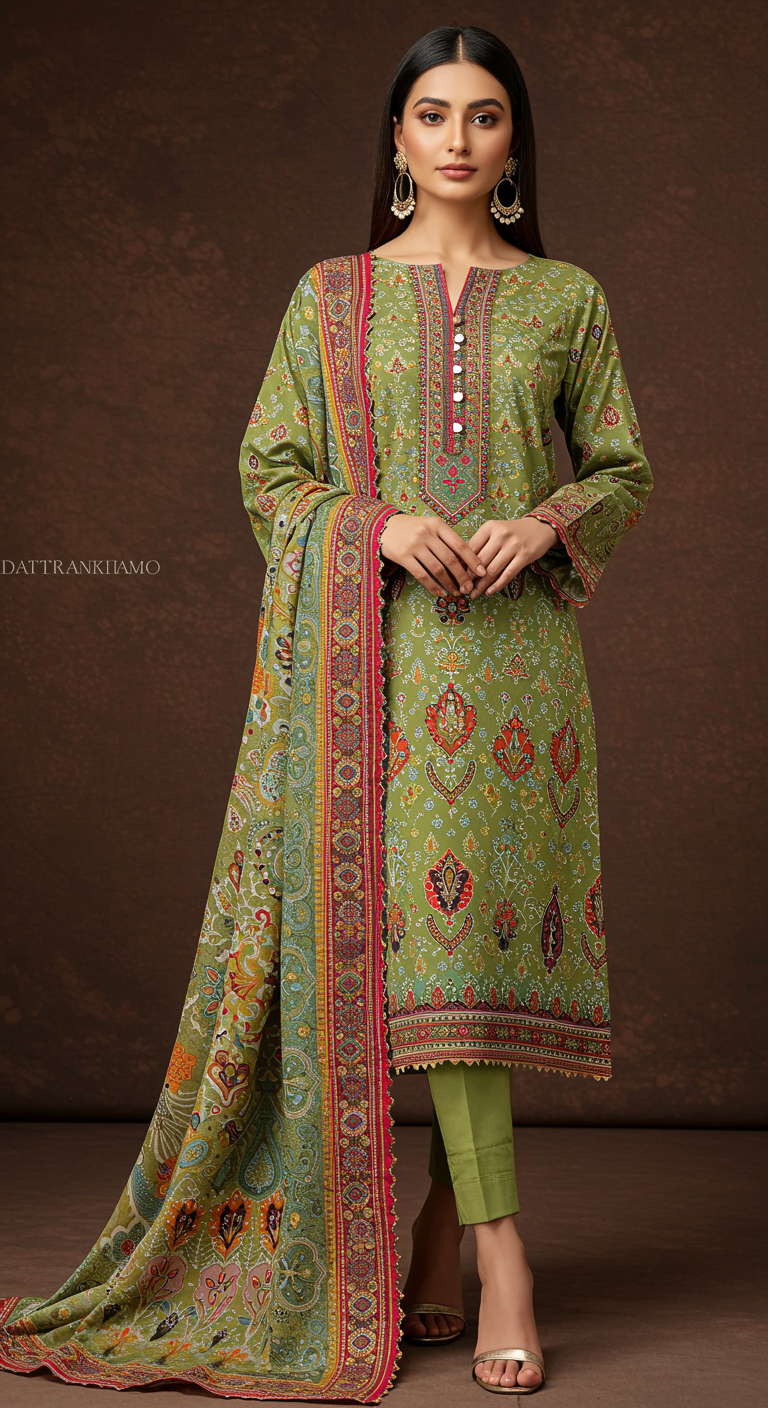 Exude timeless grace in this stunning mehendi green ensemble. This set features a rich tapestry of Patola-inspired floral motifs in deep reds and golden ambers, creating a beautiful contrast against the lush green fabric. The intricate scalloped borders of the dupatta and the delicate button-down neckline add a layer of refined sophistication, making it an essential piece for your festive collection.